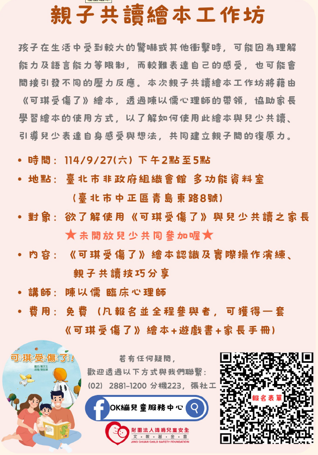 三、工作坊資訊: (一)時間:114年9月27日(星期六)下午2時至5時。 (二)地點:臺北市非政府組織會館多功能資料室。 (三)對象:欲了解使用《可琪受傷了》與兒少共讀之家長。 (四)內容:《可琪受傷了》繪本認識及實際操作演練、親子 共讀技巧分享。 (五)講師:陳以儒臨床心理師。 (六)費用:免費。
