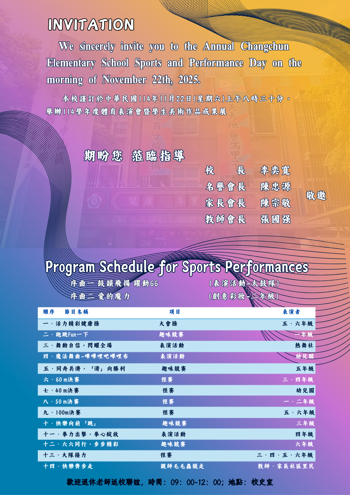 We sincerely invite you to the Annual Changchun Elementary School Sports and Performance Day on the morning of November 22th, 2025.