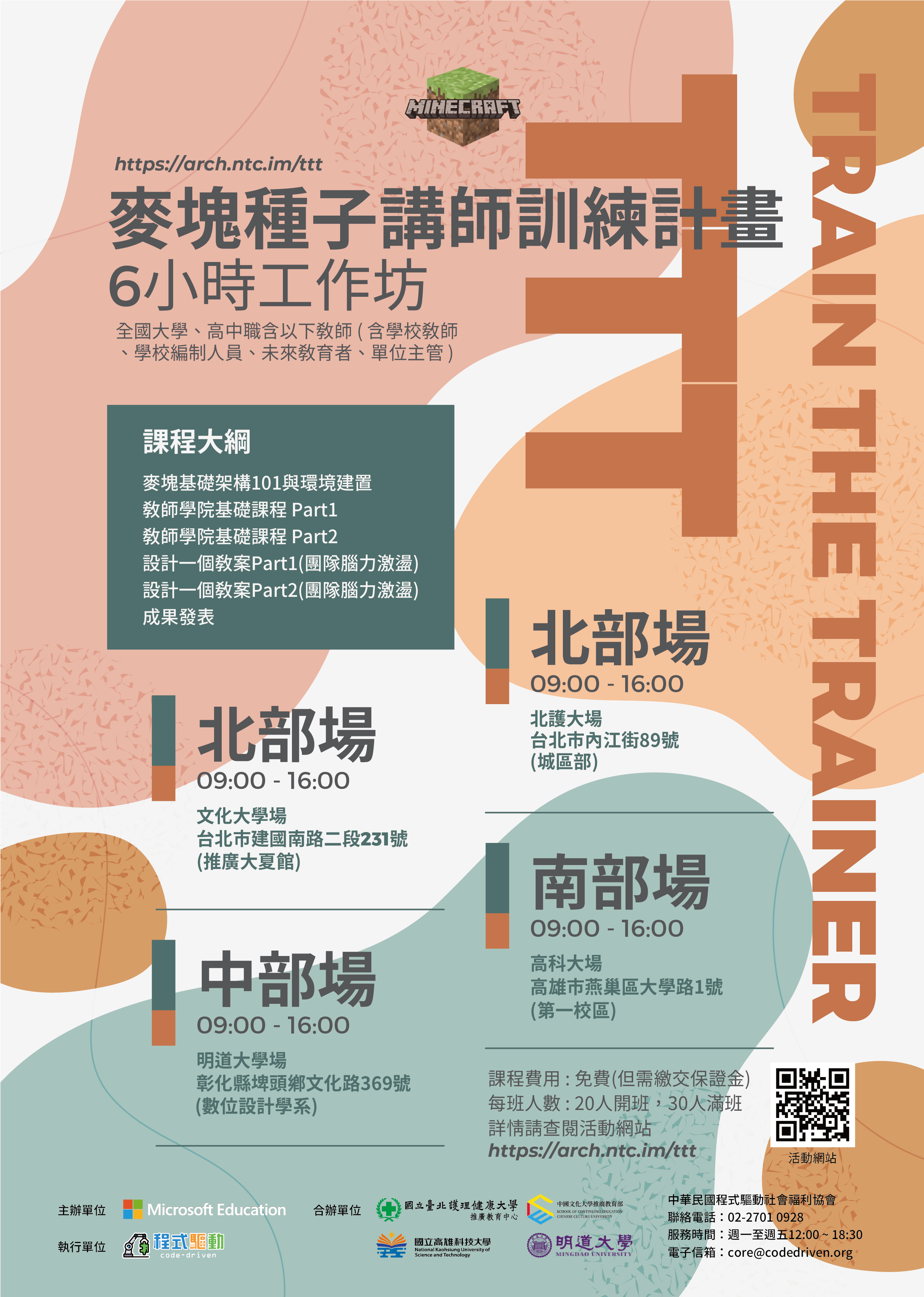 五、報名方式:於文化大學推廣教育部:https://reurl.cc /5M81jz,與全國教師在職進修資訊網兩處皆完成報名,並 繳交保證金新臺幣300元才算報名成功。 六、全程參與者將核予【資訊非專】研習時數6小時。 七、凡完成研習之教師,皆可獲得麥塊種子講師訓練專屬紀念T-shirt一件、研習紀念貼紙一份。