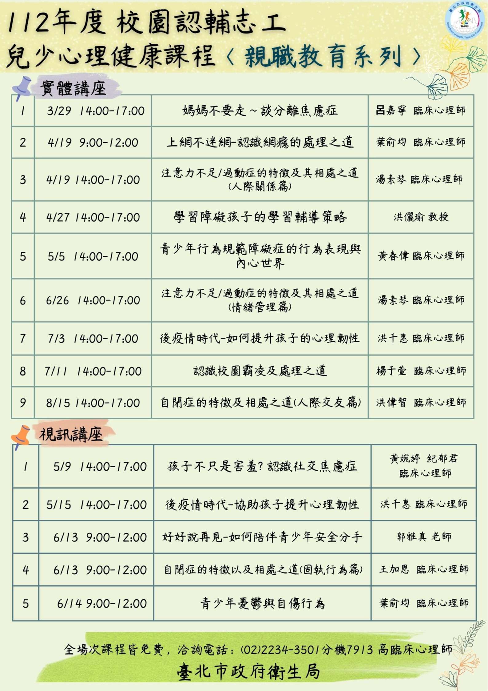 二、衛生局為增進校園認輔志工兒少相關心理衛生知能,以及家長照顧特殊兒少之親職能力,爰辦理旨揭課程。請貴校勵認輔志工及家長報名參加。