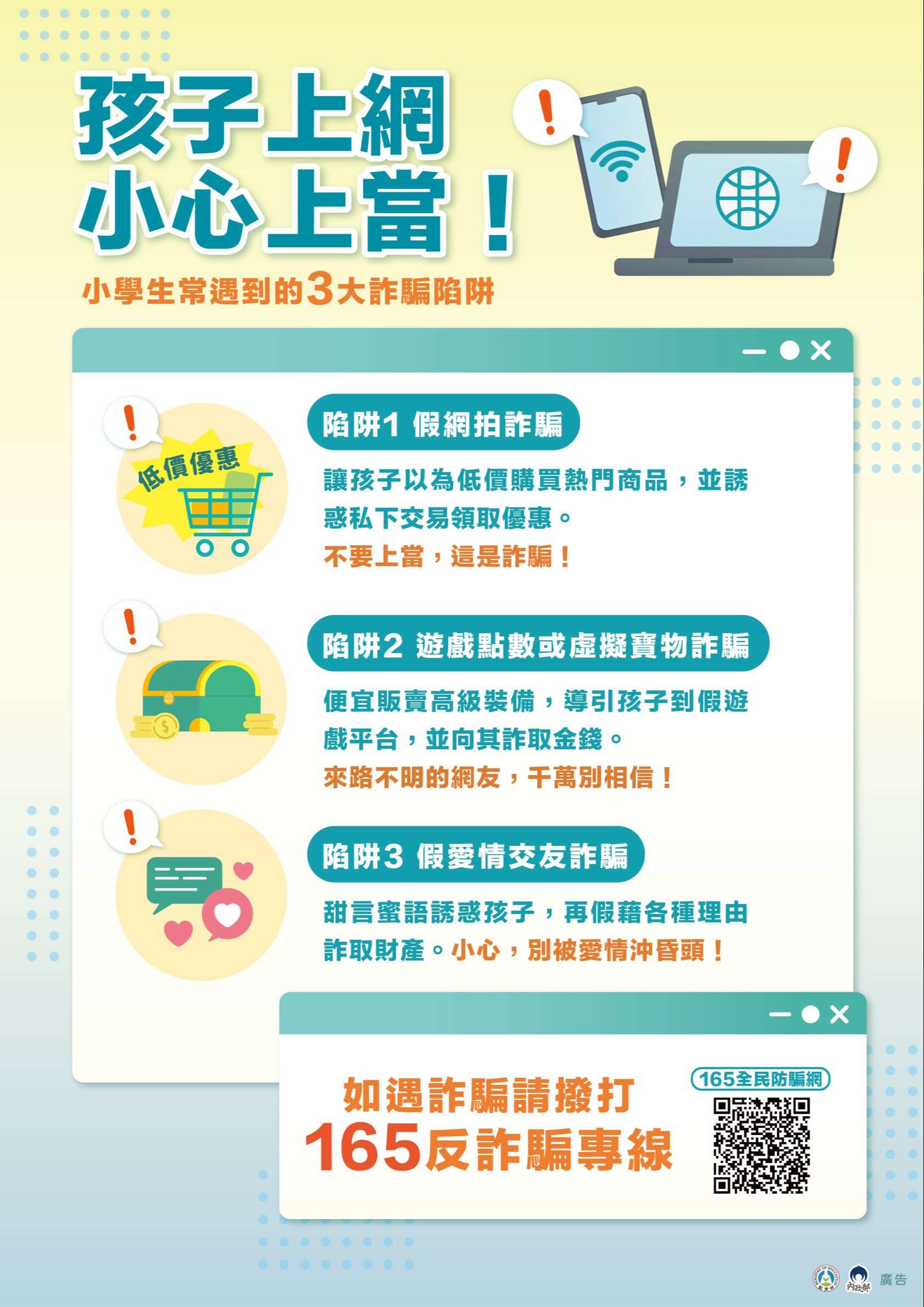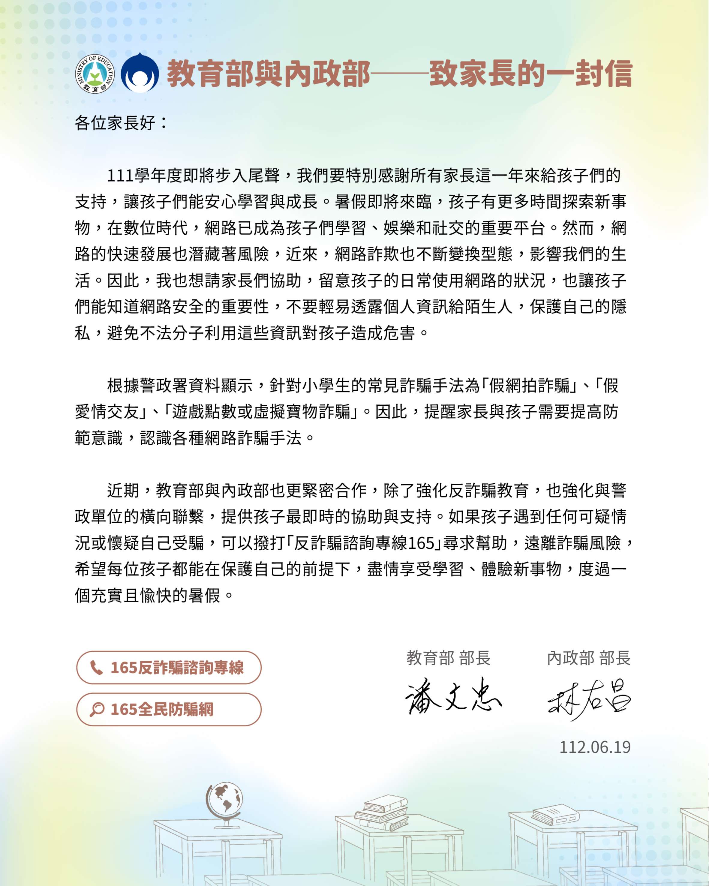為提升學生及家長之防詐免疫力,以預防近期各式不斷翻 新的詐騙手法,教育部與內政部跨部會合作,區分不同年 齡教育階段分別製作「教育部與內政部—致家長的一封 信」(含反詐騙圖卡)國高中版及國小版各1份,以整體性 提升學生及家長識詐之能力,避免成為詐騙受害者。