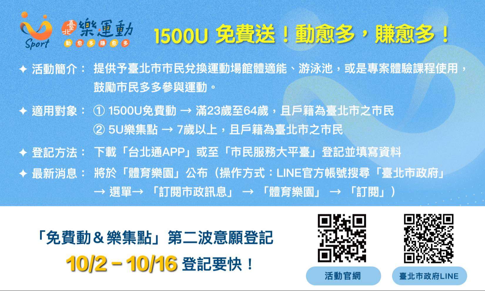 (一)1500U免費動:23~64歲市民於活動期間內申請本次活動,經身分審核通過後將派發1,500運動點(U幣)至民眾 台北通帳戶,民眾出示台北通通行證QRCode掃碼入場, 即可折抵運動場館健身房與游泳池單次入場使用費以及專案體驗課程費用。