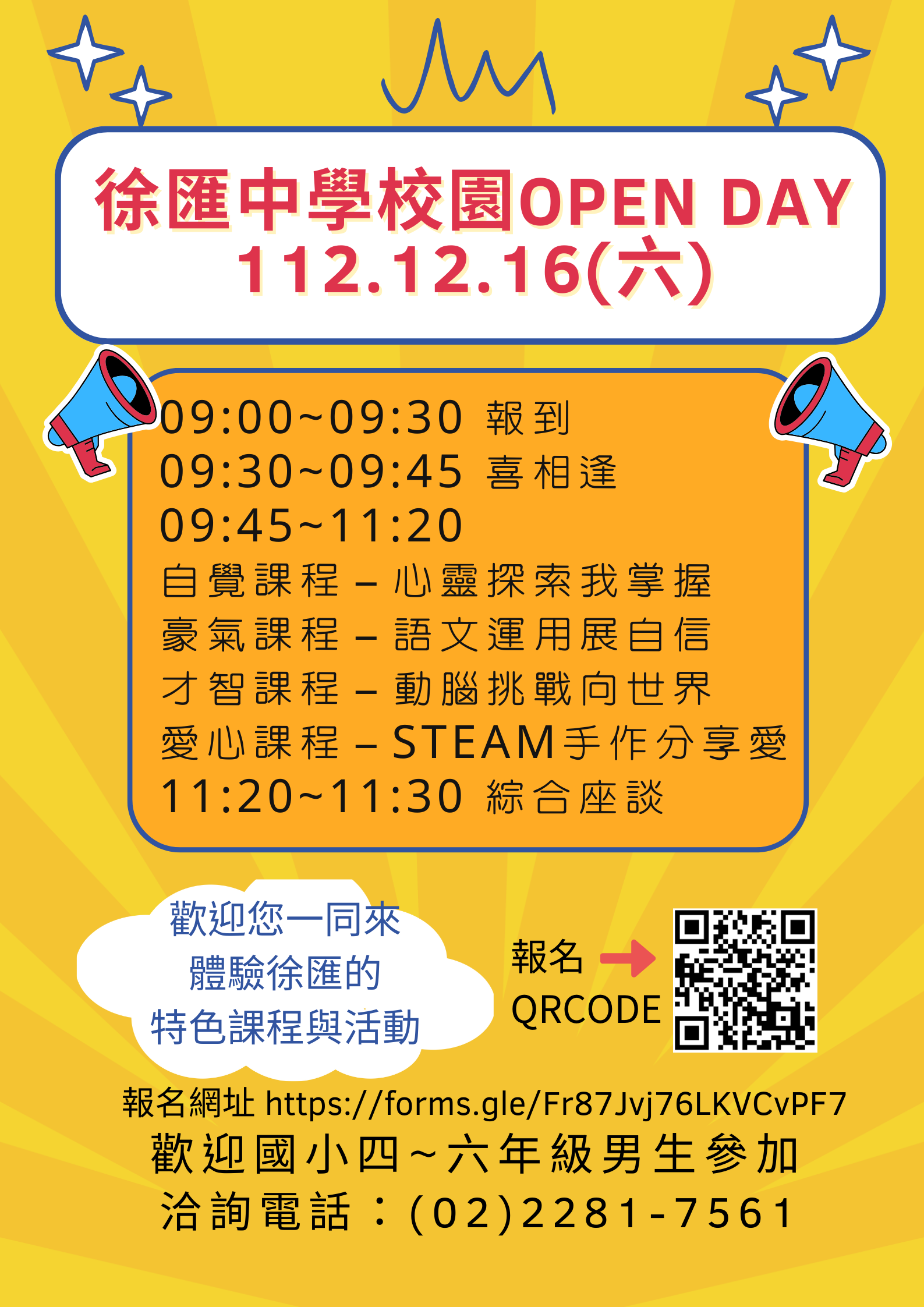 一、徐匯中學著重培育學生具備自覺、才智、愛心、豪氣四大能 力,歡迎國小學生參加本校辦理之「徐匯OPEN DAY」,親自體驗特色課程及特色活動。