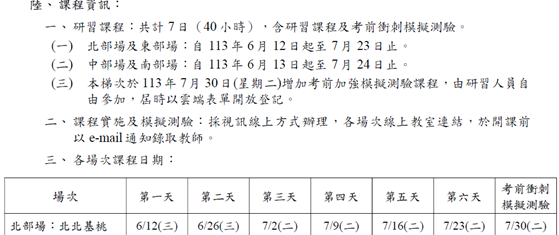 2、本梯次於113年7月30日(星期二)增加考前加強模擬測驗課程,由研習人員自由參加,屆時以雲端表單開放登記。