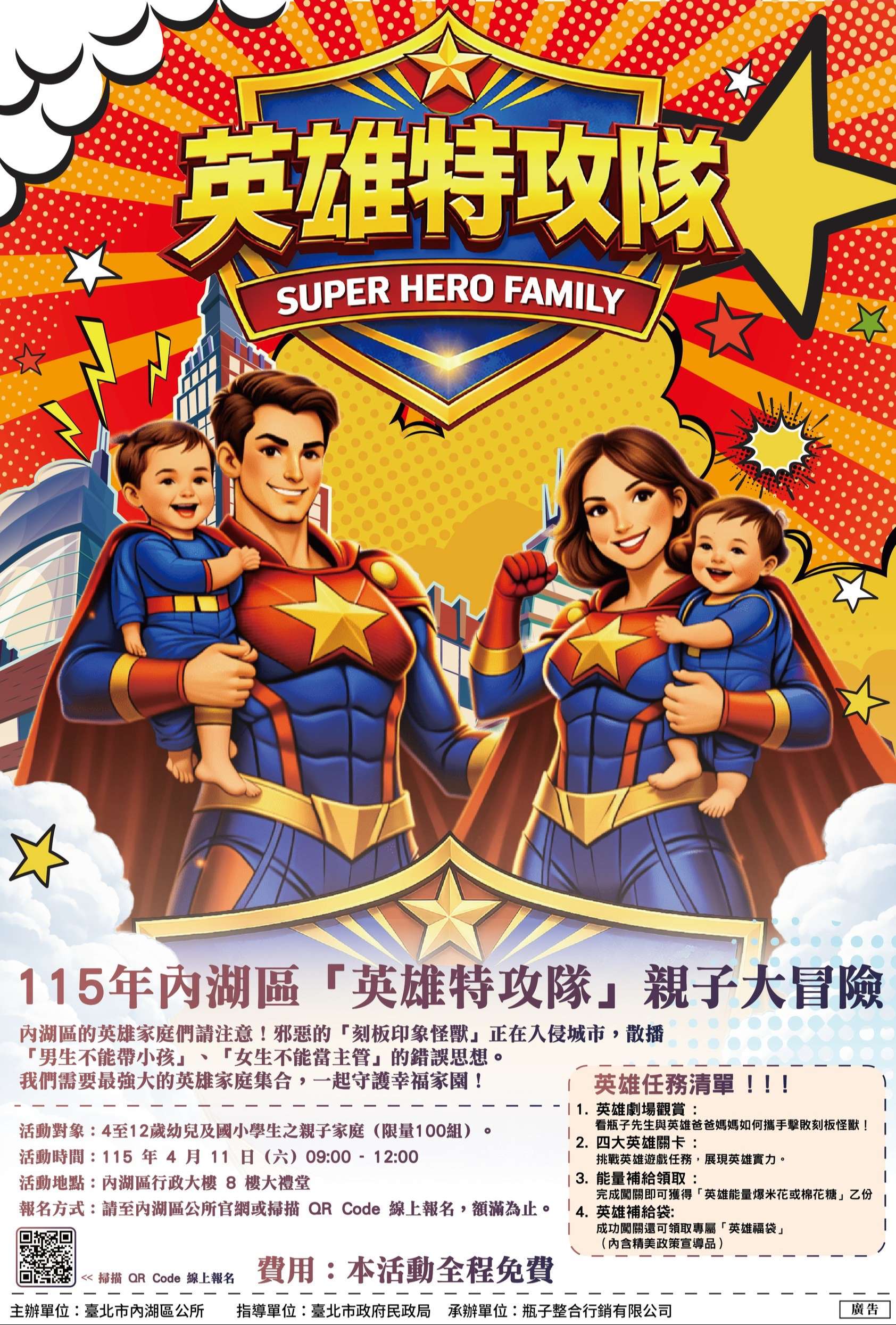 活動包含魔術劇場、英雄闖關摸彩及限量能量補給甜點,帶孩子體驗不一樣的英雄特訓!詳情及報名請上內湖區公所官網查詢或參考附件。