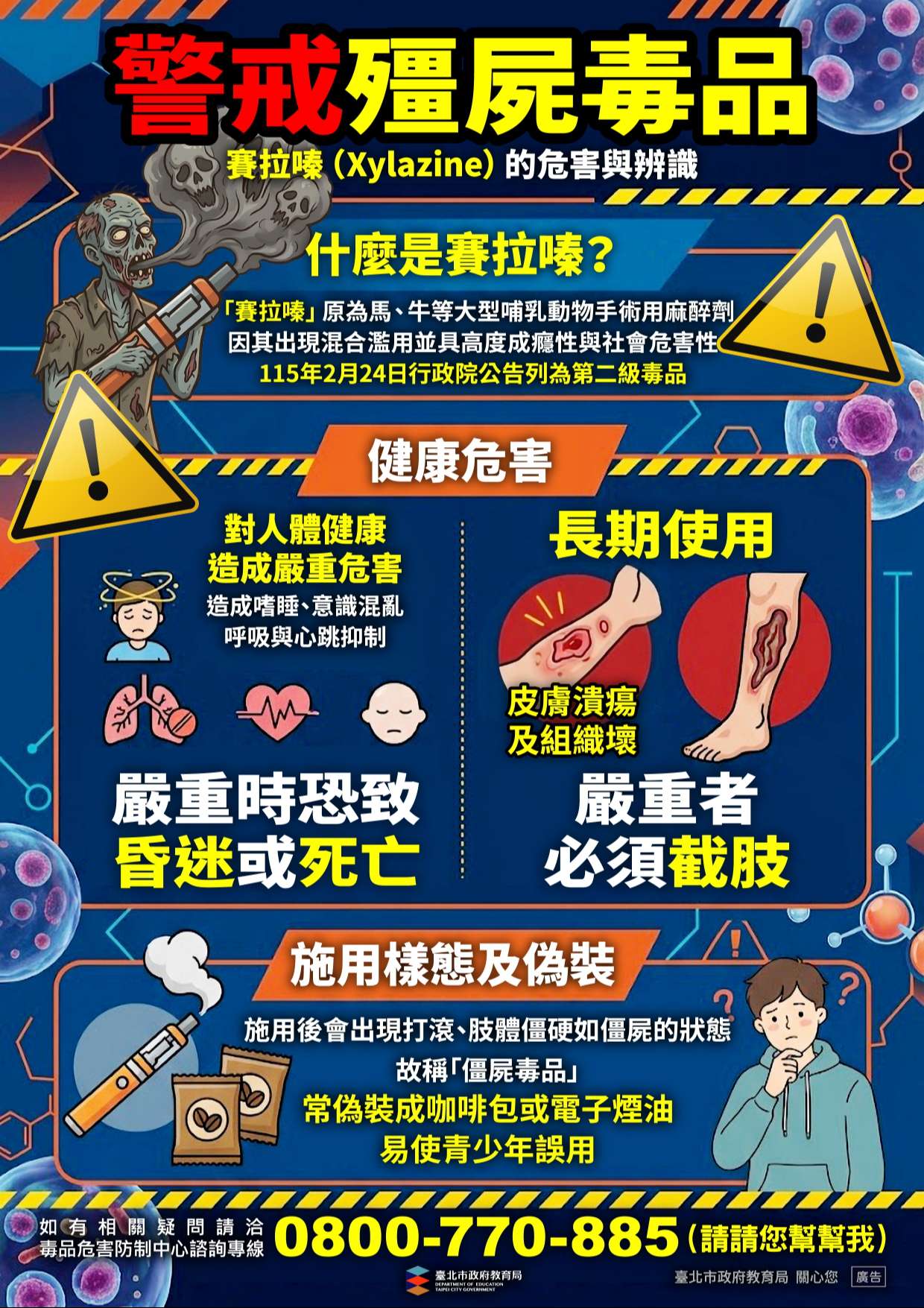 二、「賽拉嗪(Xylazine)」原為獸醫使用之麻醉藥物,近年遭濫用並常與其他毒品混合使用,施用後會出現打滾、肢 體僵硬如僵屍的狀態, 故稱「僵屍毒品」。
